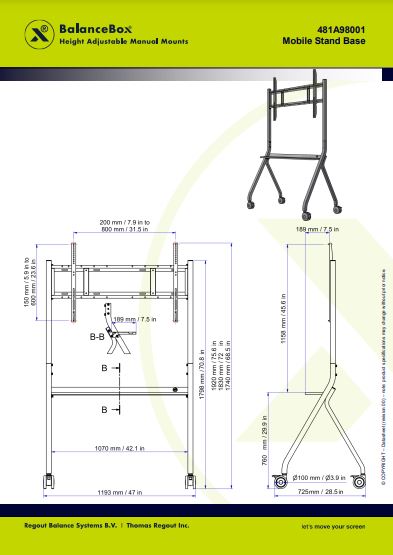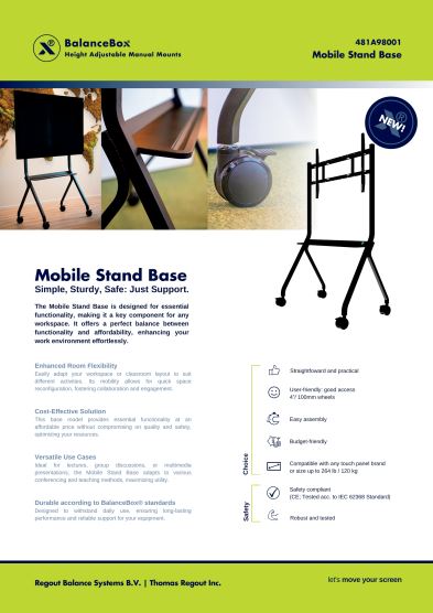 BalanceBox Mobile Stand Base on yksinkertainen ja tyylikäs isojen näyttöjen telineratkaisu tilaan kuin tilaan. Ratkaisu tarjoaa täydellisen tasapainon toimivuuden ja kohtuuhintaisuuden välillä; se on turvallinen, tukeva ja helposti liikuteltava. Lisäksi Mobile Stand Base on nopea ja helppo asentaa.