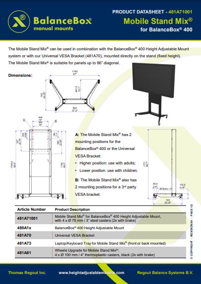 BalanceBox Mobile Stand Mix on tukeva ja liikuteltava telineratkaisu suurille kosketusnäytöille ja näytöille. Suurin telineeseen soveltuva näyttökoko on 86” (diagonaali) ja maksimipaino 125 kg. Mobile Stand Mix -telineen voi halutessaan päivittää jälkikäteen nopealla ja manuaalisella BalanceBox 400 -sarjan korkeussäätöjärjestelmillä.