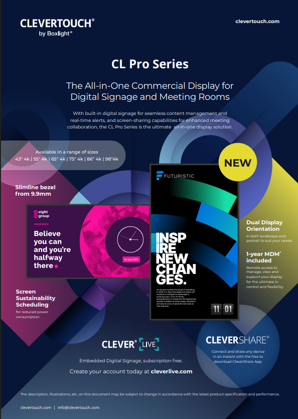CL Pro -malliston näytöt ovat ammattikäyttöön suunniteltuja sekä oppilaitosten että yritysten viestintätarpeisiin. Sisäänrakennetun mediasoittimen johdosta näytöt on helppo asentaa ja liittää osaksi organisaation kokonaisvaltaista viestintäjärjestelmää.
