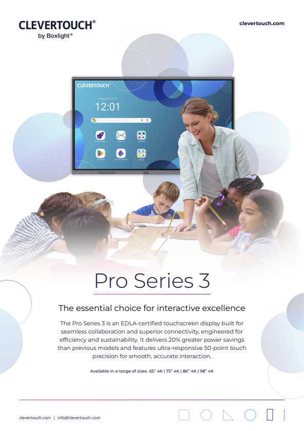Pro Series 3 on EDLA-sertifioitu kosketusnäyttö, joka on suunniteltu sujuvaa yhteistyötä ja erinomaista liitettävyyttä varten, optimoituna tehokkuuteen ja kestävyyteen. Se tarjoaa 20 % suuremmat energiansäästöt aiempiin malleihin verrattuna ja sisältää erittäin herkän, 50 pisteen kosketustarkkuuden sujuvaa ja tarkkaa vuorovaikutusta varten.